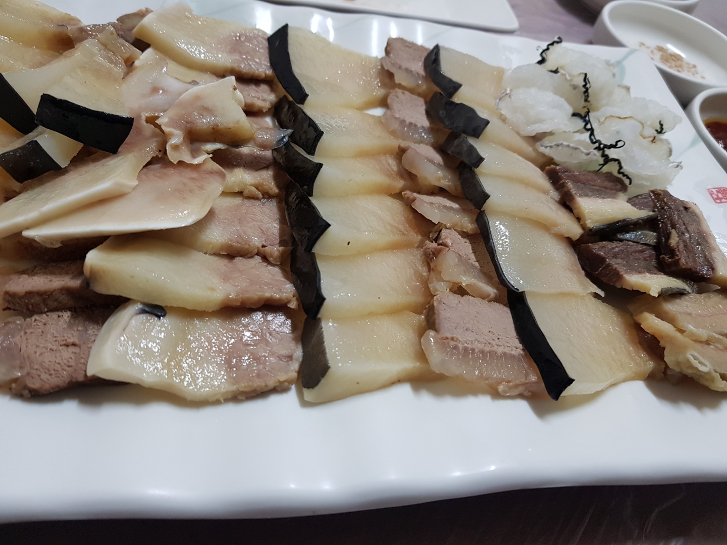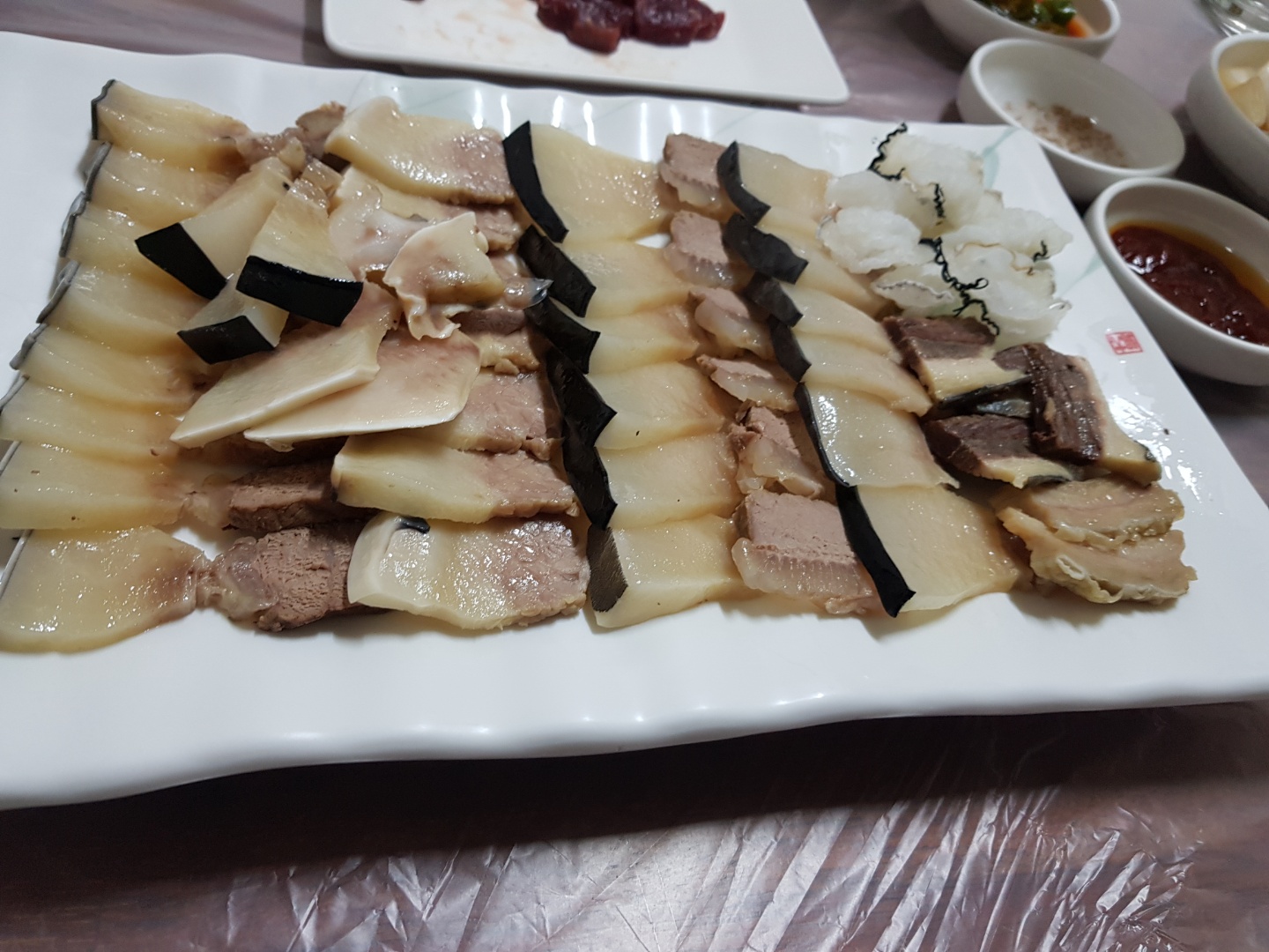 부위마다 차이는 있는데 돼지고기 수육과 비슷한 맛이 있고 마치 젤리를 먹는 듯한 부위도 있었다. 대체로 처음 맛보는 향은 강하게 느껴졌다.