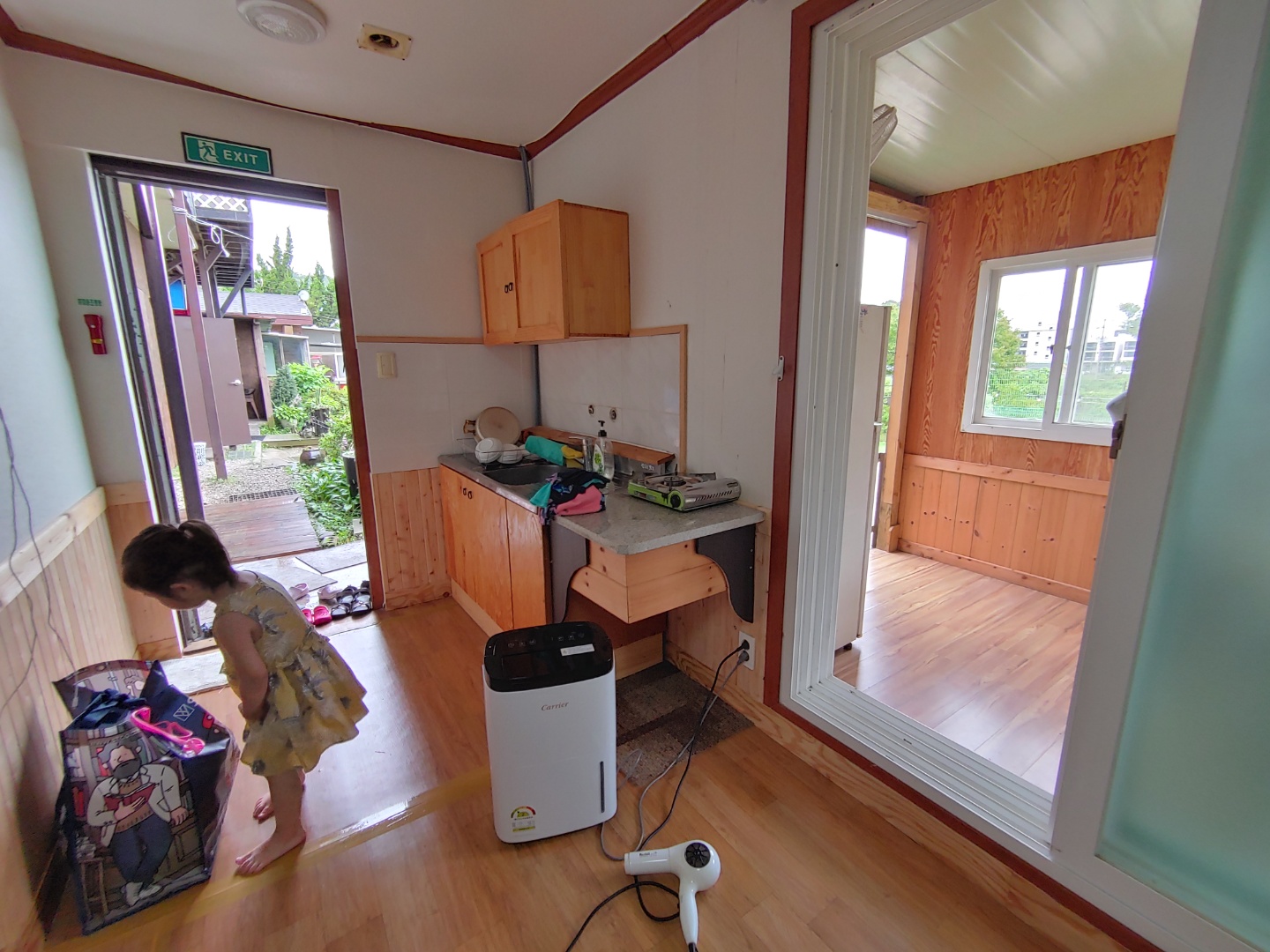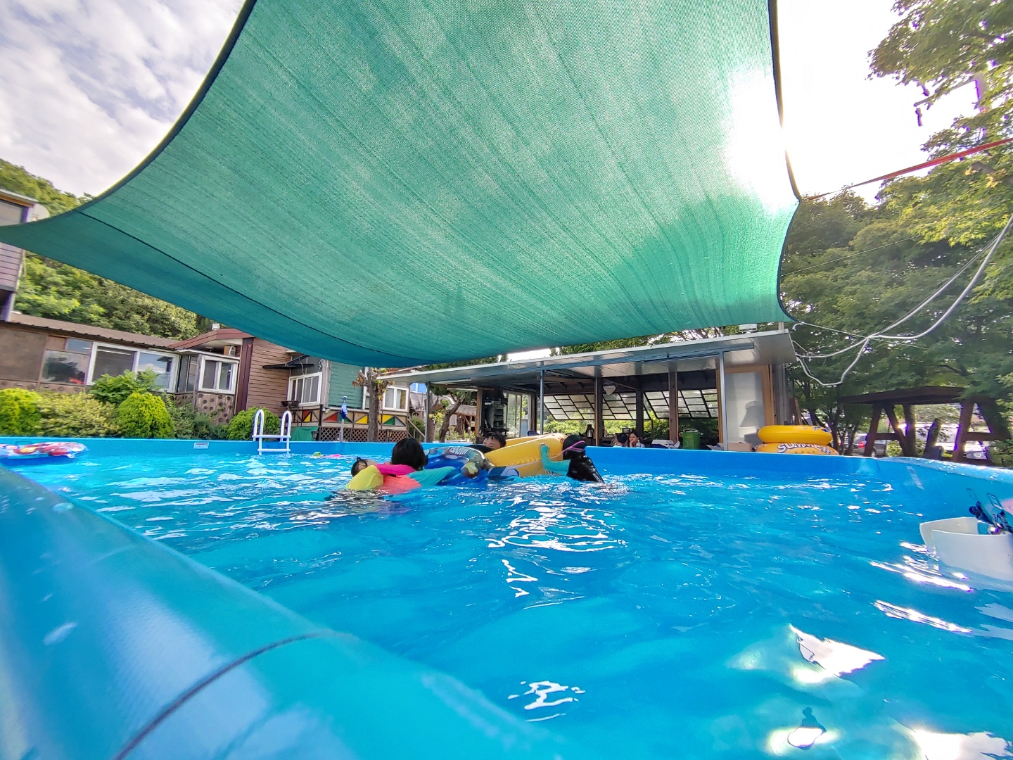 수영장 깊이도 많이 깊지 않아 어린아이들도 정말 재밌게 놀 수 있습니다. 신나게 물놀이를 하고 족구장이 빌 때에는 이렇게 야외에 옷도 말릴 수 있습니다. 햇볕이 강해 금방 마릅니다.