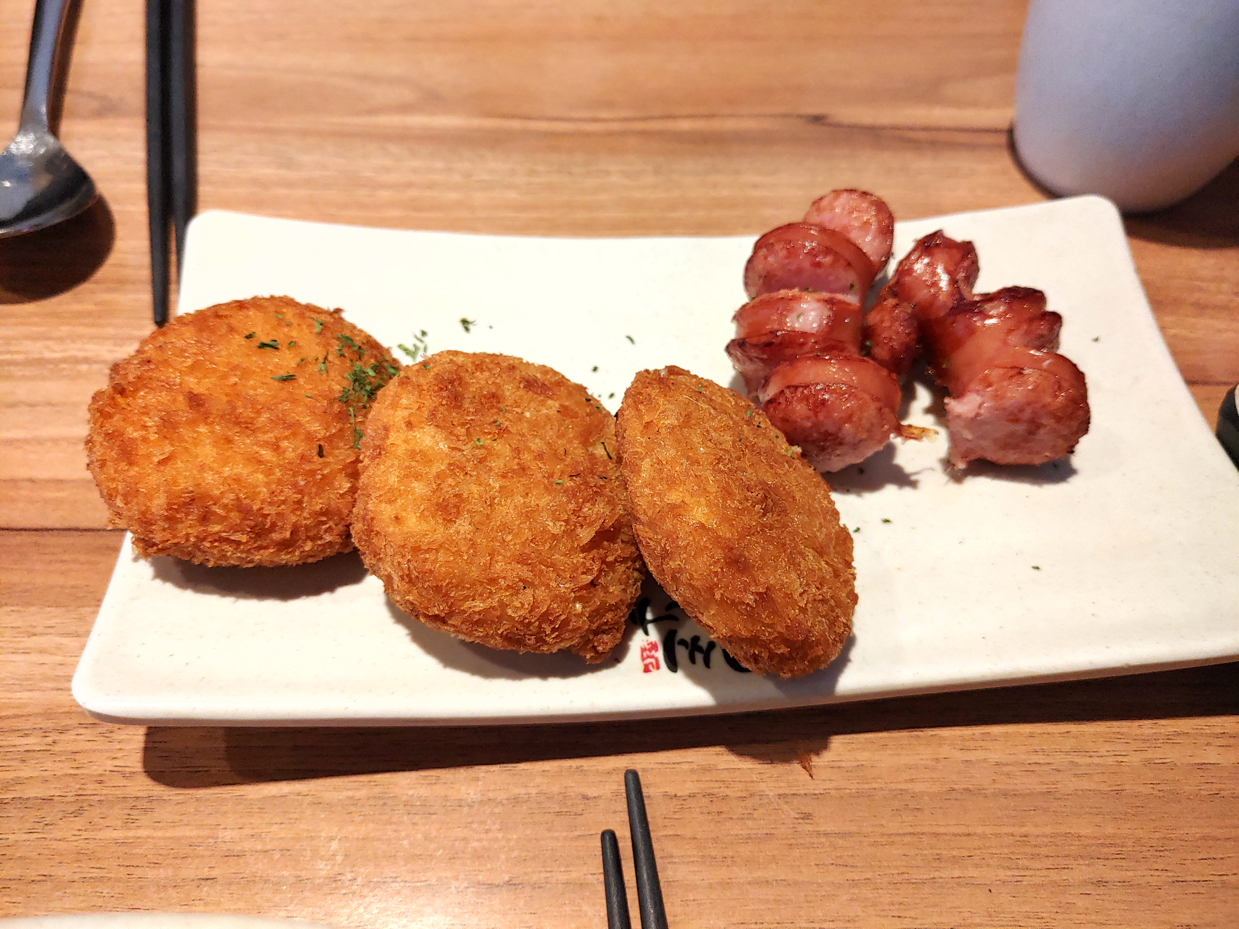 먼저 주문한 사이드 메뉴 감자고로케와 소세지가 나왔다. 감자고로케는 바삭하고 속은 감자가 들어있어 촉촉했다. 사이드 메뉴로 고로케도 같이 먹는 것도 좋은 듯하다.
