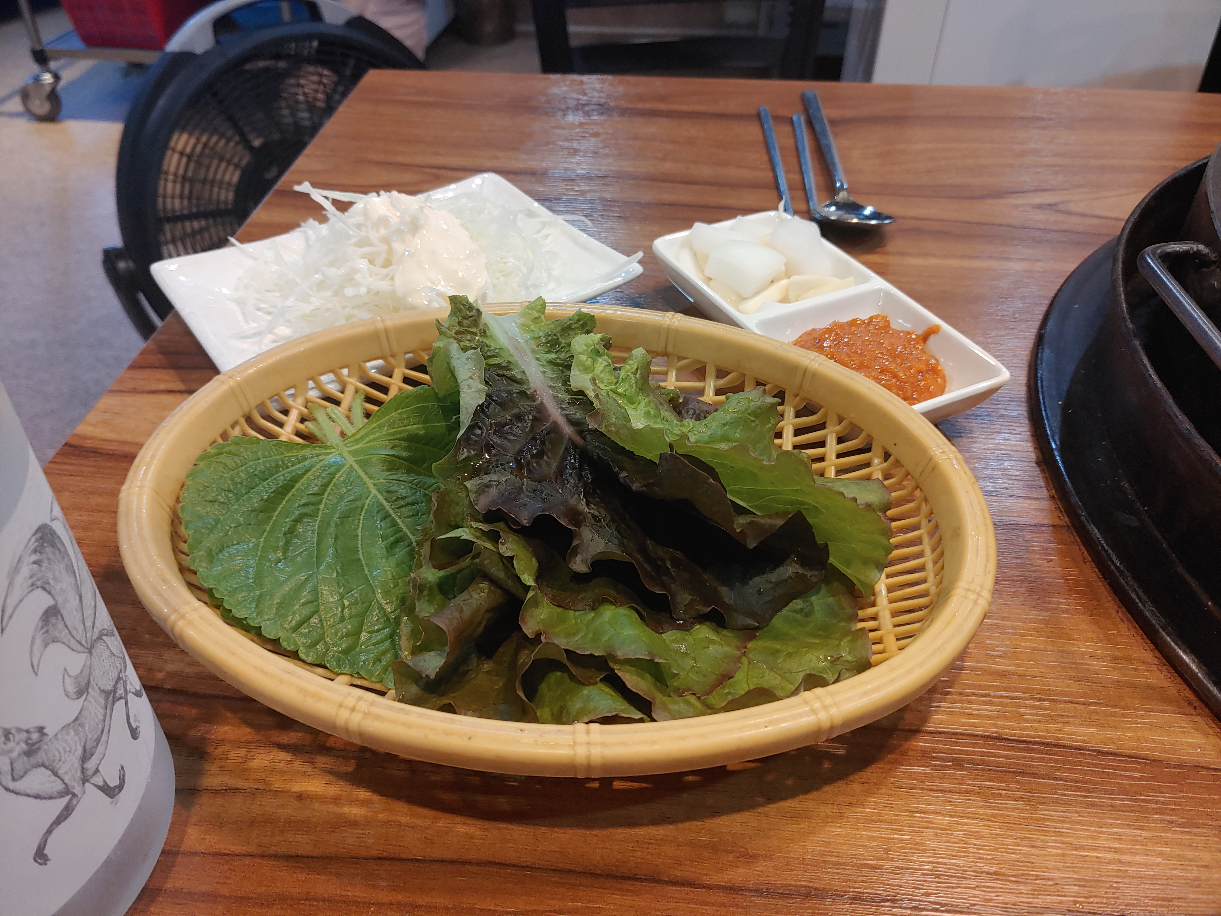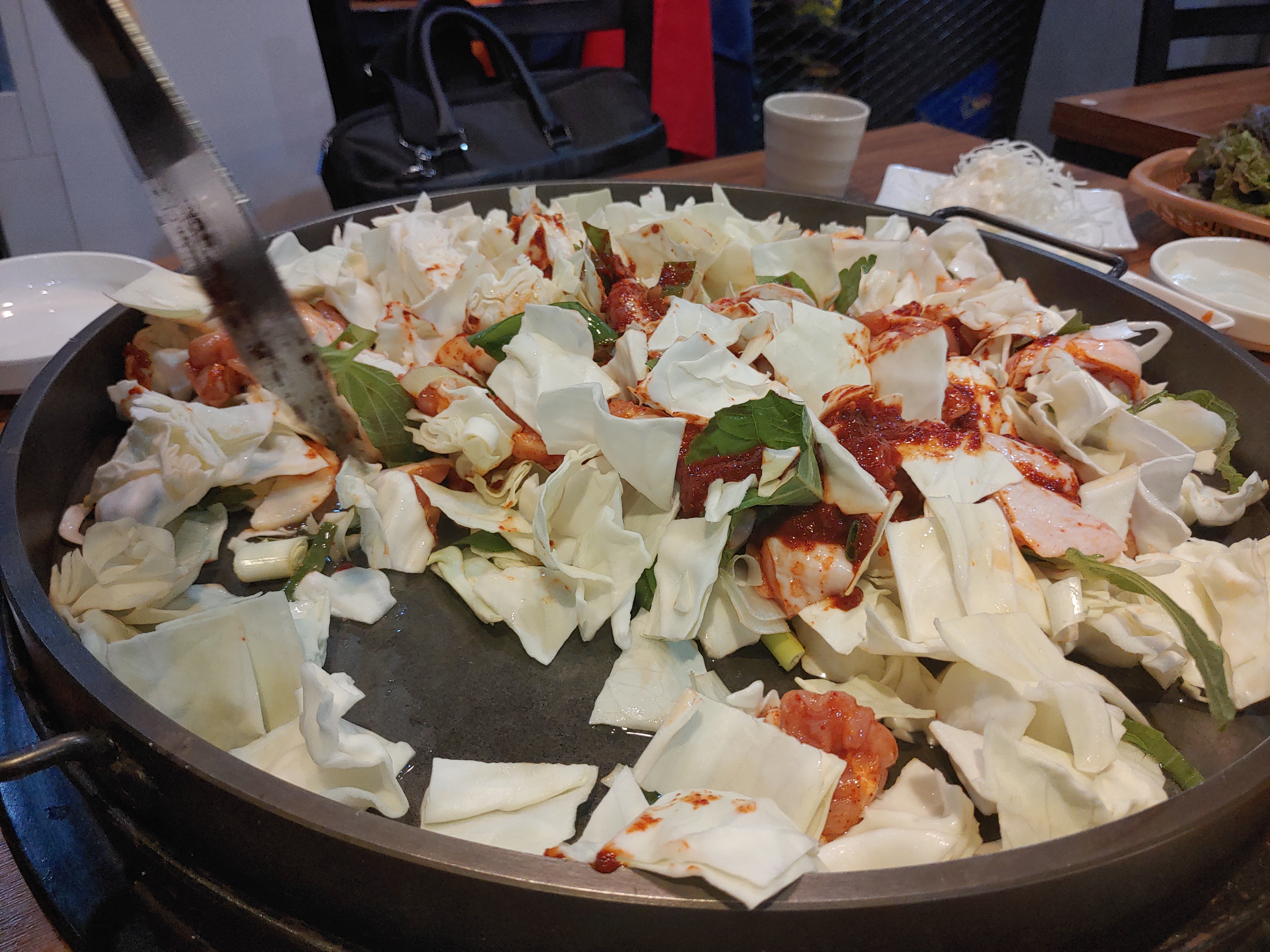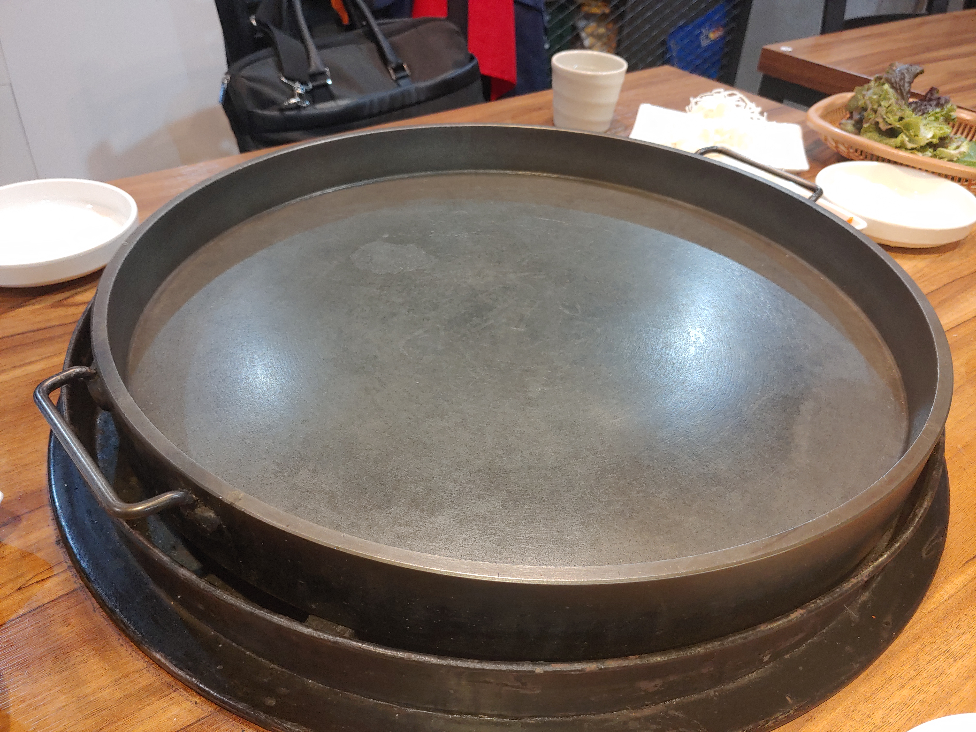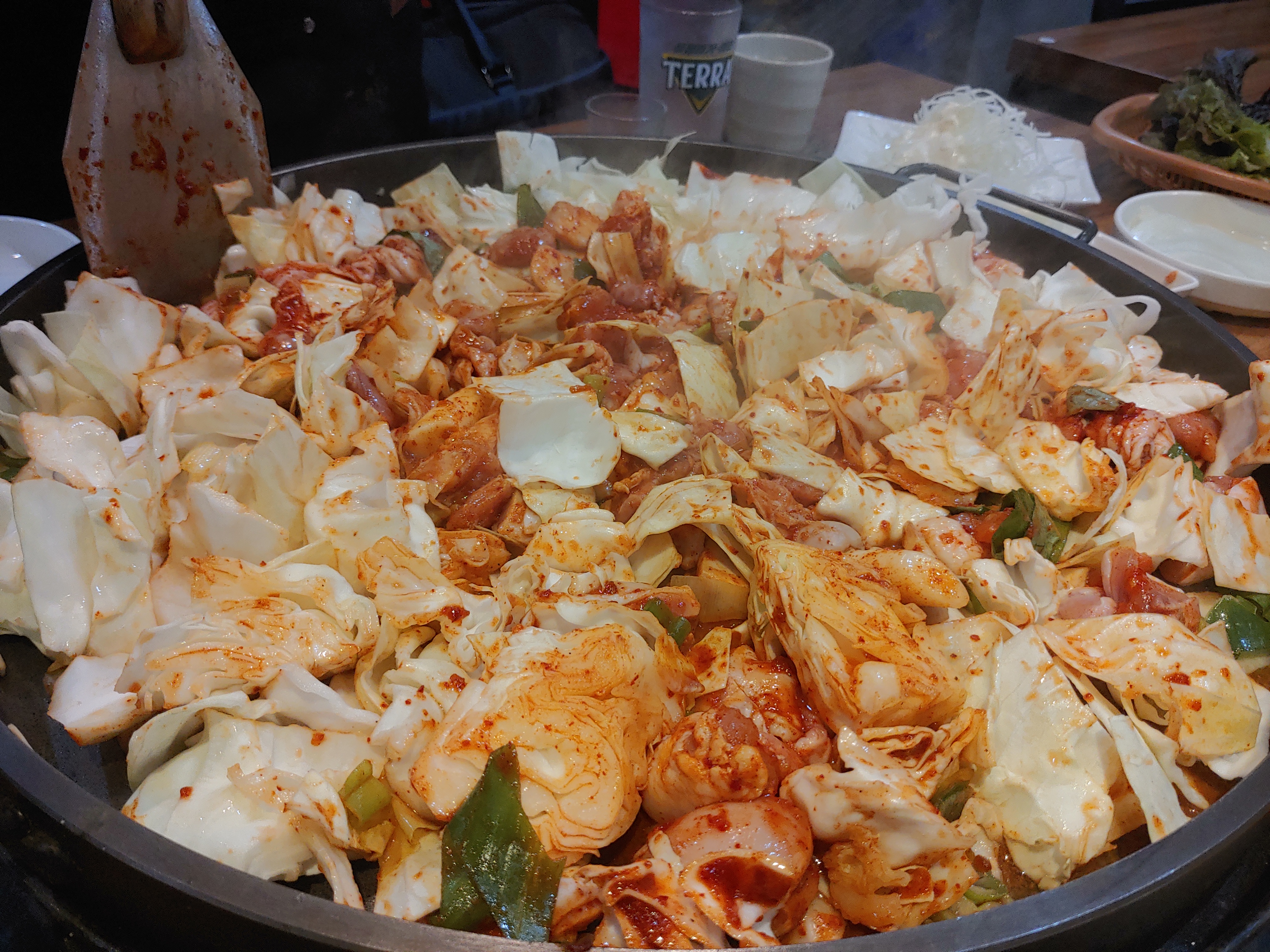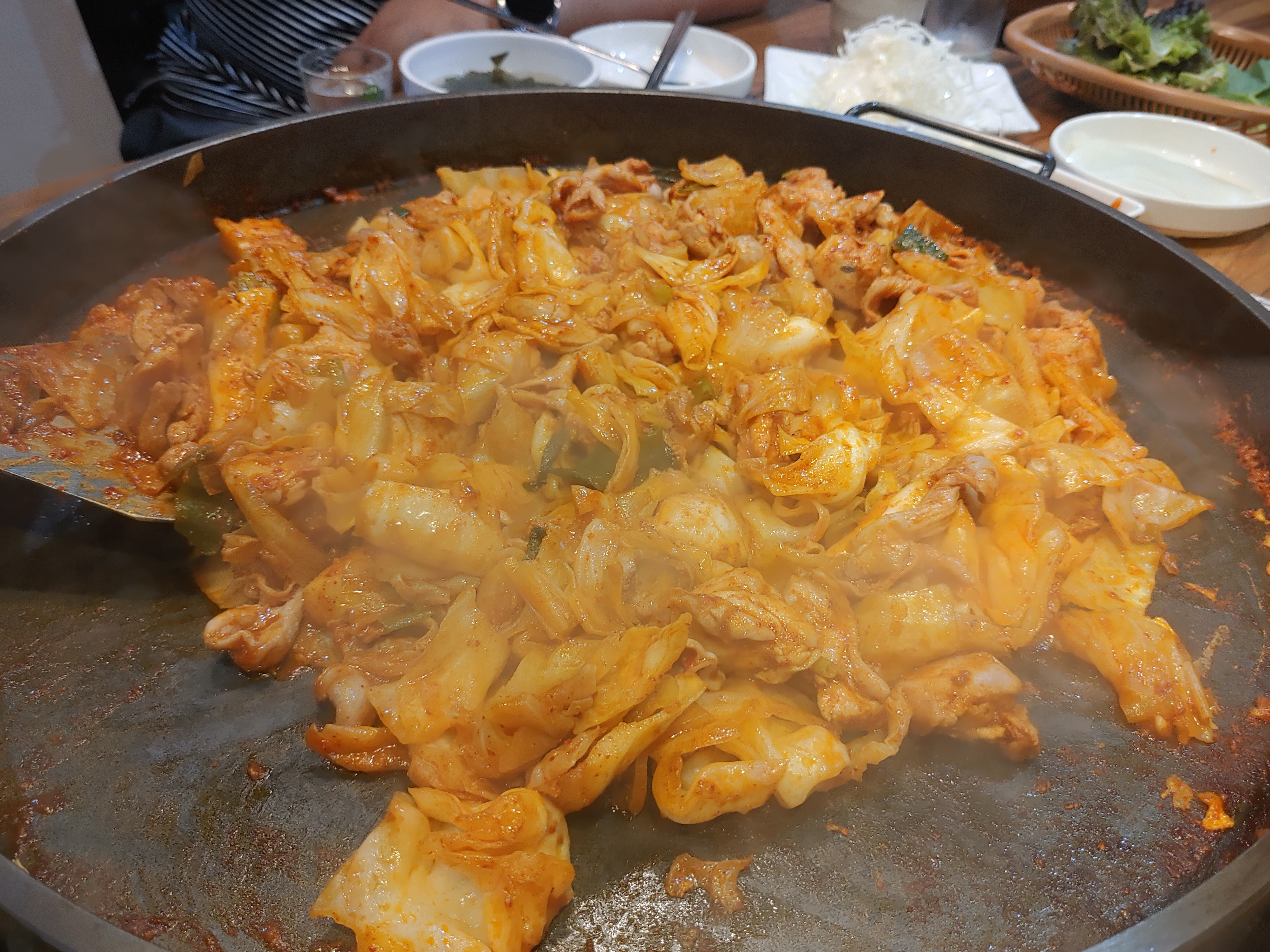 기본적인 밑반찬은 상추와 양배추 샐러드가 나온다. 다른 집과 마찬가지로 닭갈비집만의 상징이라고 해야 하나? 동그란 철판이 있다.