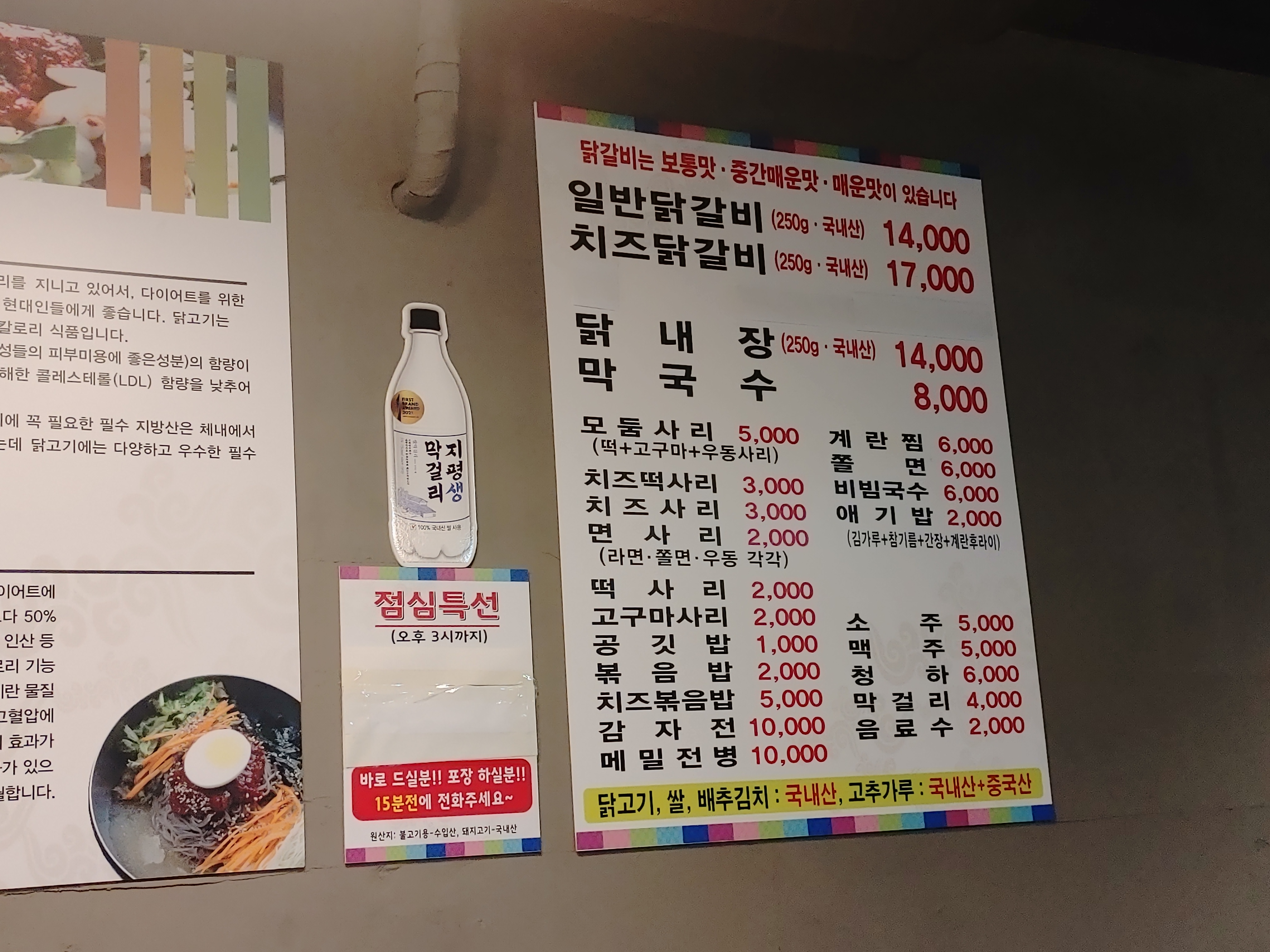 메뉴는 일반 닭갈비와 치즈 닭갈비가 있다. 모두 국내산을 쓰고 있다고 했다. 기타 사리들하고 사이드 메뉴가 있다. 특이한 점은 닭내장이 있다는 것이다. 닭내장을 파는 곳은 못 본 것 같다. 닭내장도 개인적으로 정말 좋아한다. 이유는 맛있다.^^ 우리는 일반닭갈비 3인분과 닭내장 1인분을 주문했다.