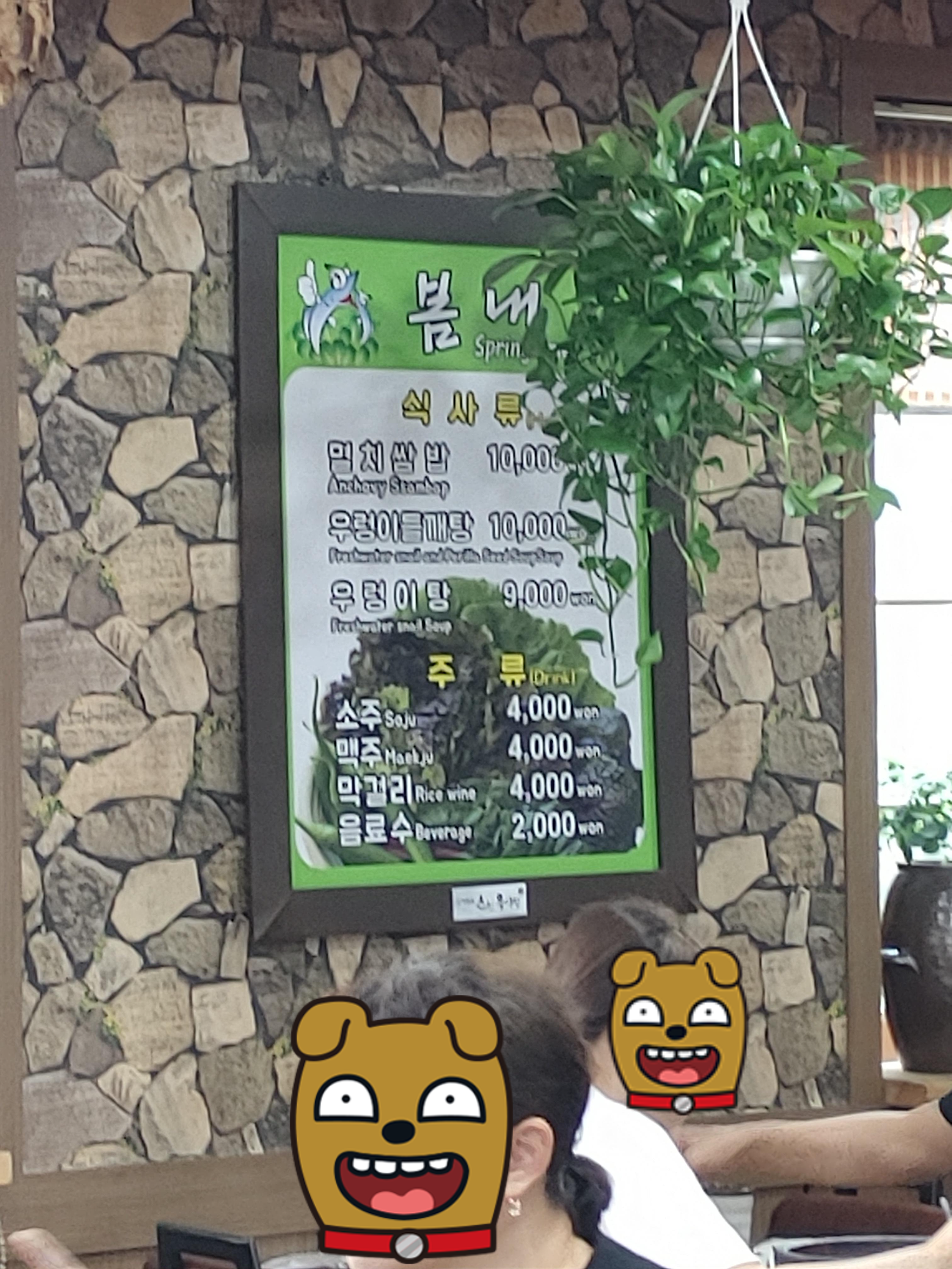 봄내 메뉴와 가격은 멸치쌈밥(10,000원), 우렁이들깨탕(10,000원), 우렁이탕(9,000원)으로 구성이 돼있다.