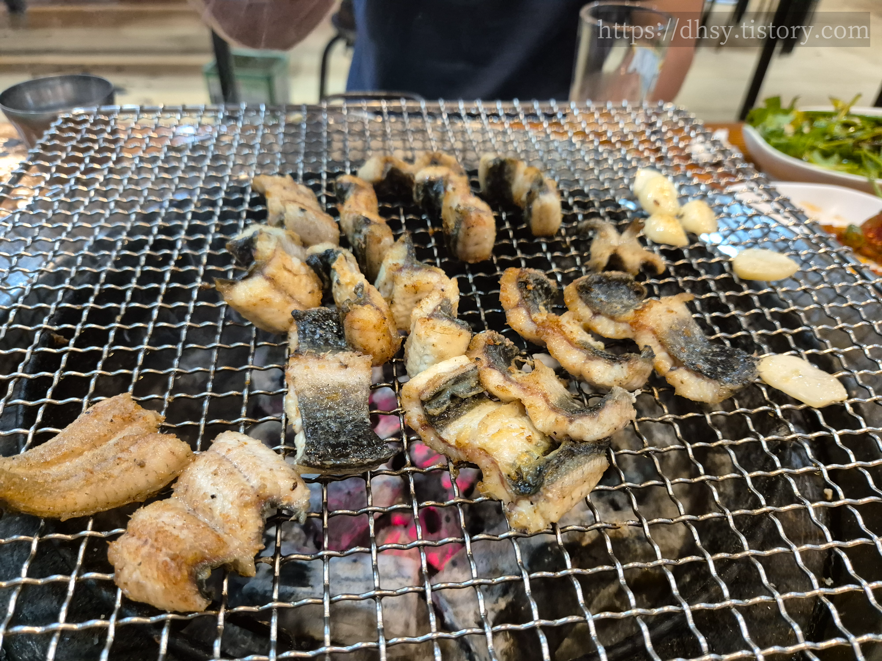 민물장어가 나오기까지는 시간이 조금 걸렸는데 알고 보니 초벌구이를 해서 주셨다. 아무래도 초벌구이를 해서 오는 게 편하기는 하다. 기름기 좔좔 흐르는 고단백의 민물장어는 보기맛해도 군침이 돈다.