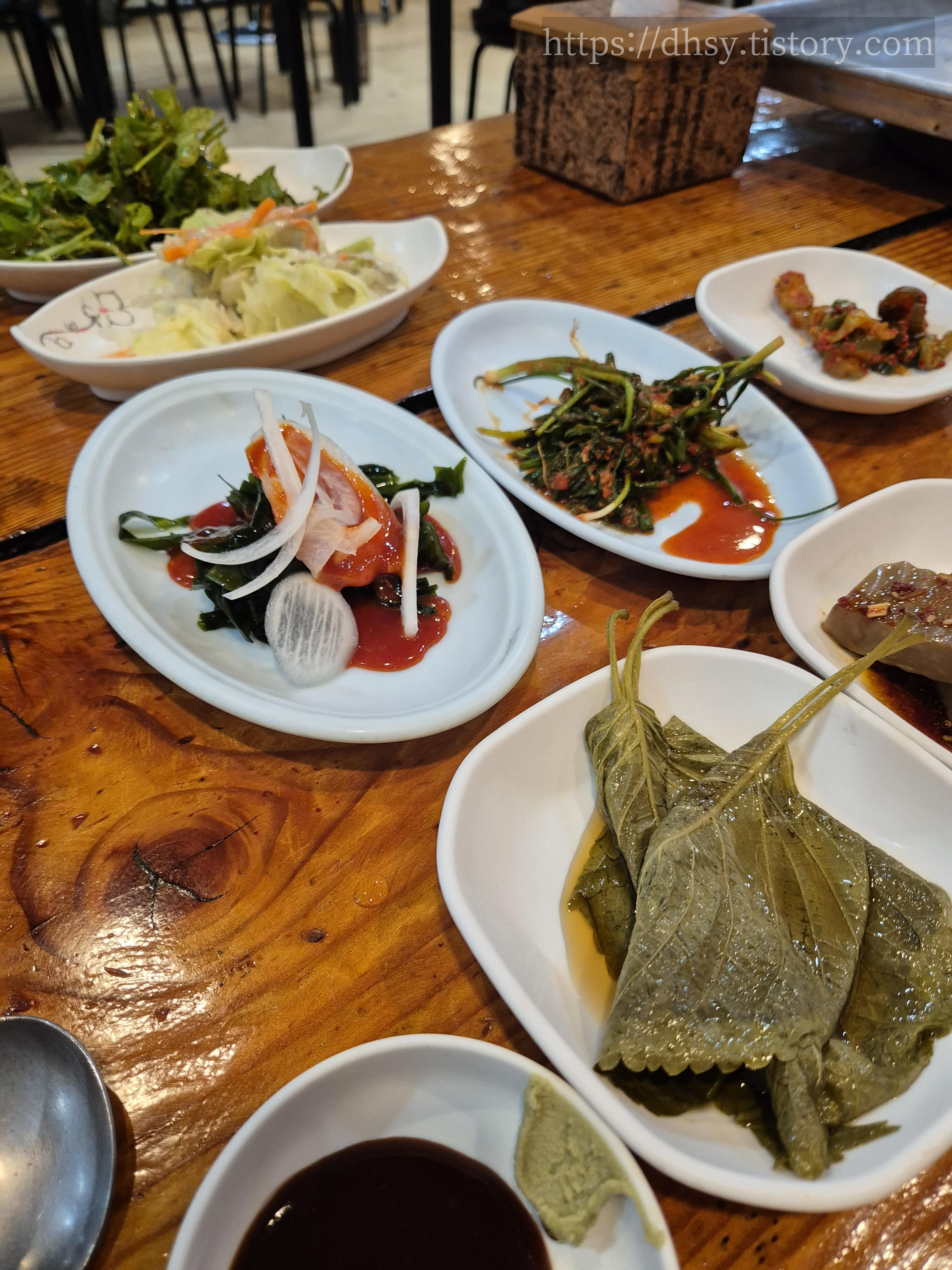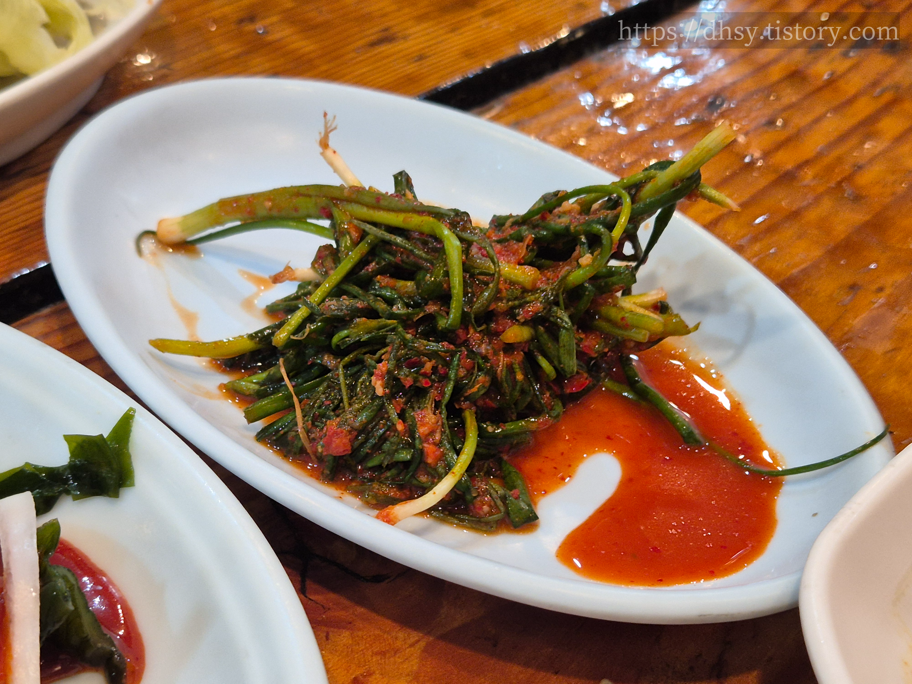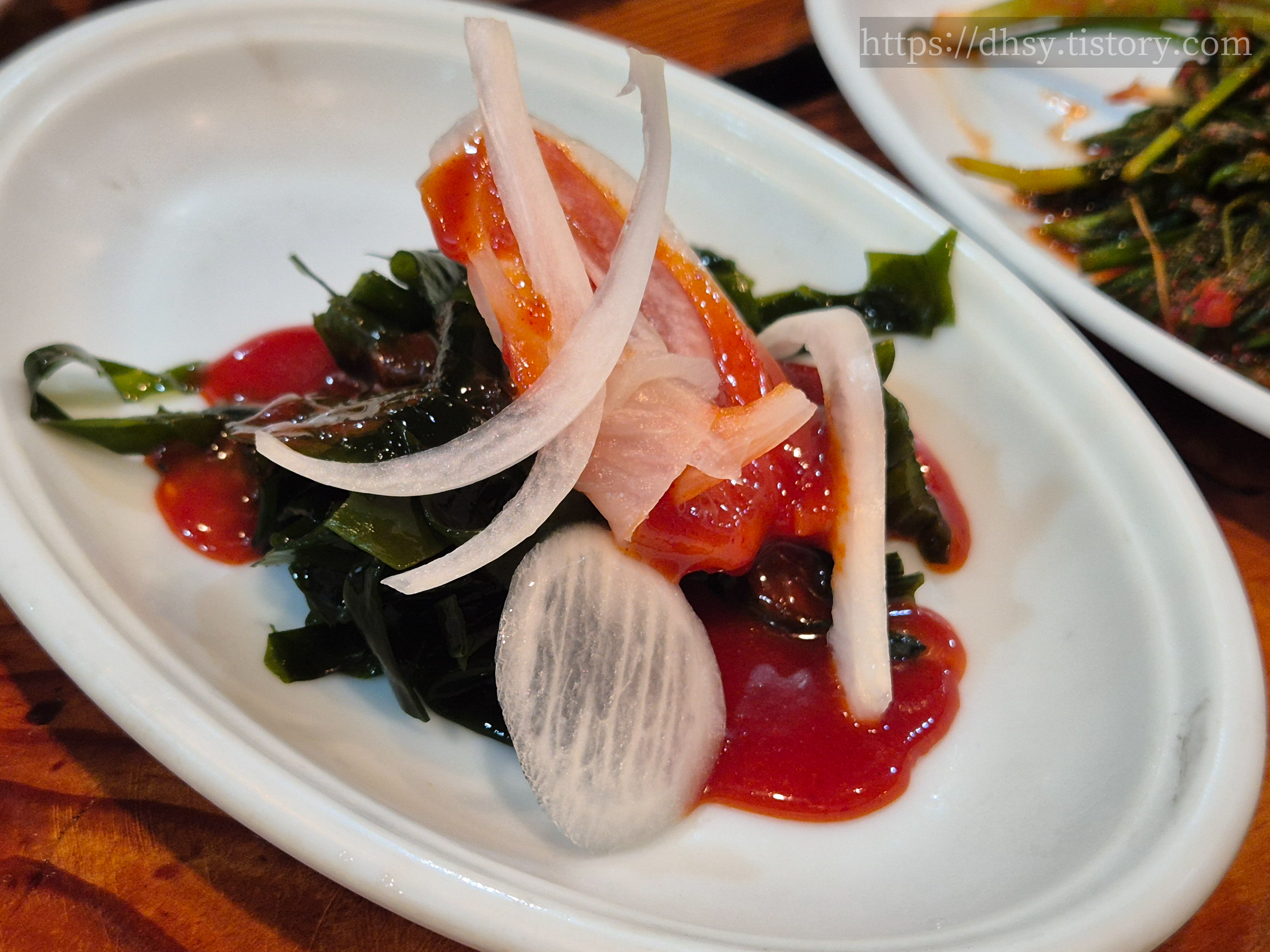 여러 가지 밑반찬이 나왔는데 개인적으로 미역과 초장, 양파가 잘 어울려 맛있었다. 대부분의 밑반찬들이 맛있었다.