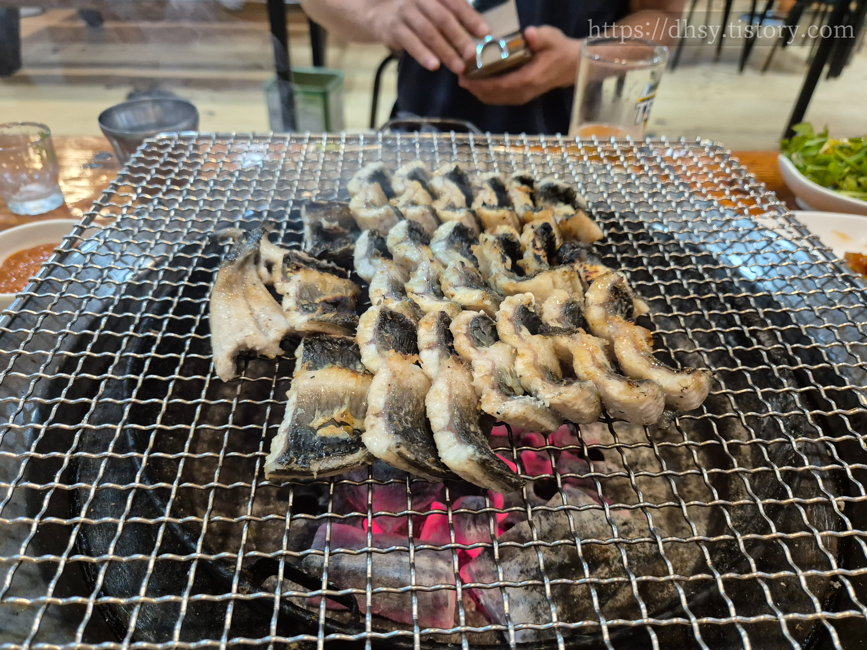 실내에 지푸라기로 많든 파라솔이 있으니 뭔가 색달랐다. 해외 나온 느낌도 살짝 있다. 우선 우리는 민물장어 2인분을 주문했다. 돼지갈비도 먹고 싶었지만 민물장어를 먹고 힘을 내고 싶었다.