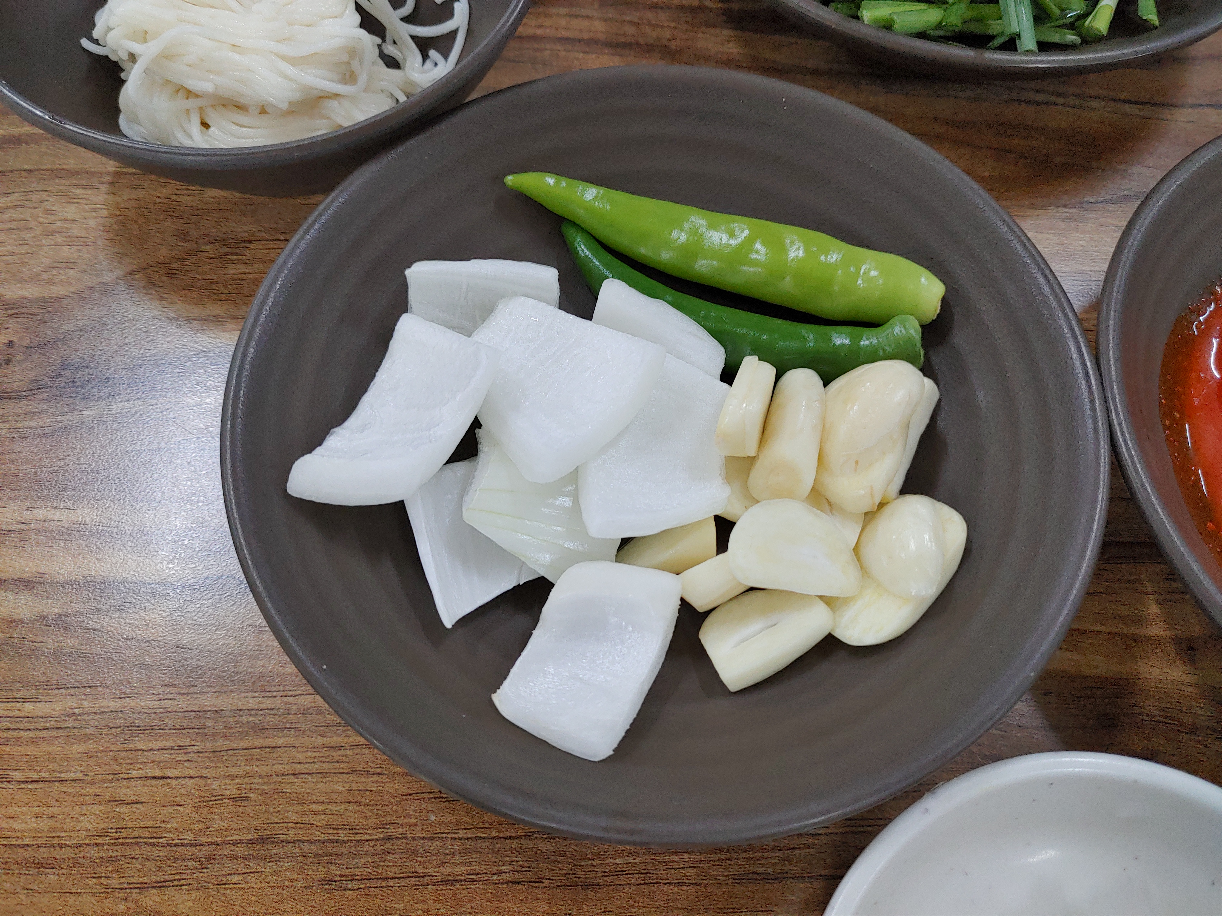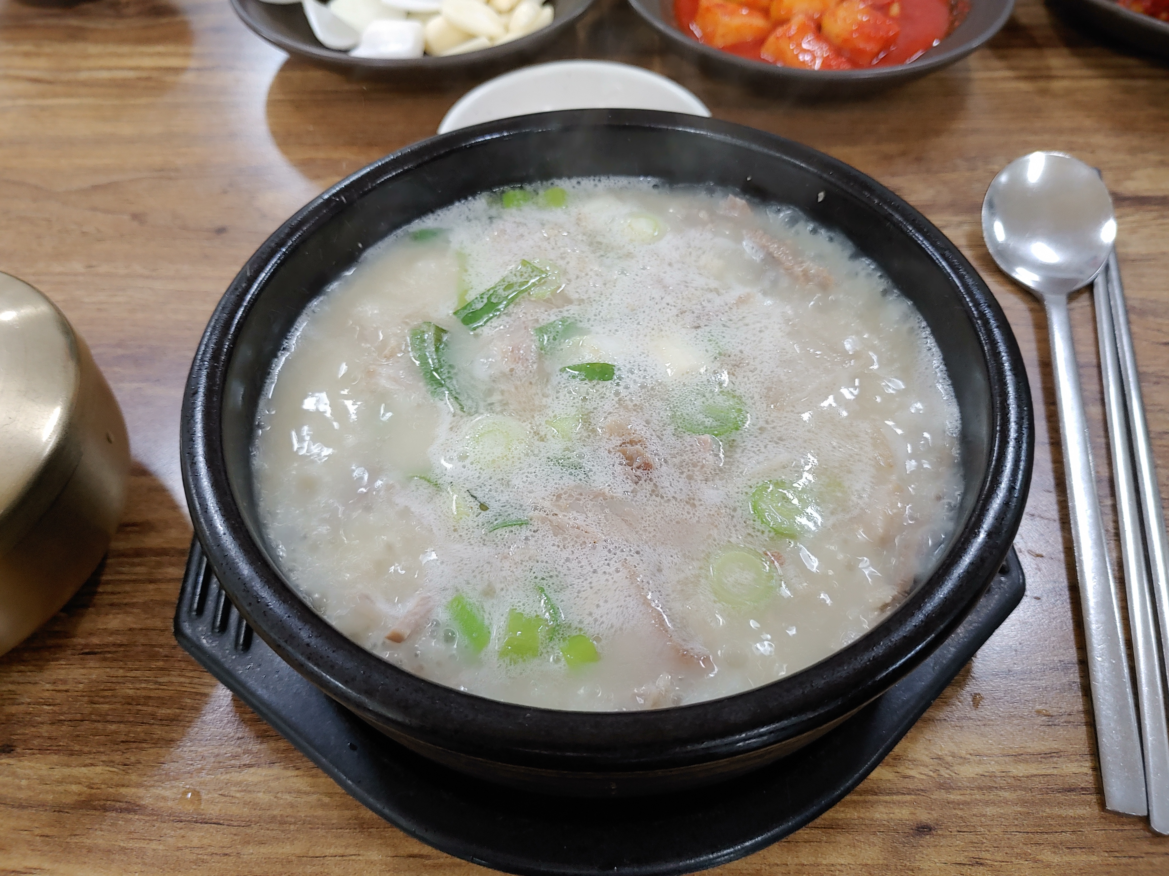 밑반찬은 깍두기와 김치 그리고 부추, 양파, 마늘, 고추가 나왔다. 특이한 점은 국수도 같이 나왔다는 것이다. 보통 국수는 설렁탕 메뉴에서나 나오는 걸로 알고 있었다. 돼지국밥에서도 나온다니 조금은 특이했다.