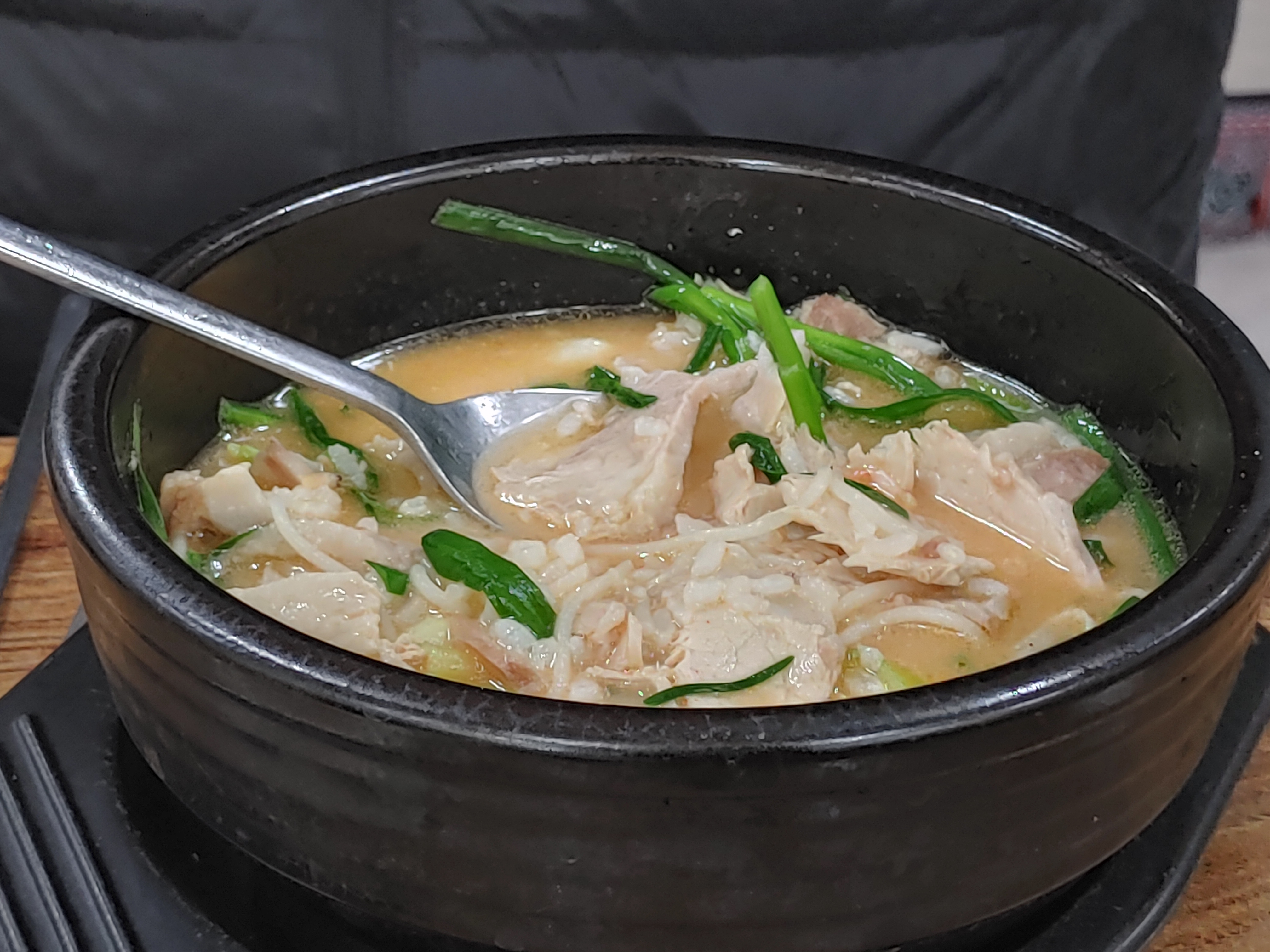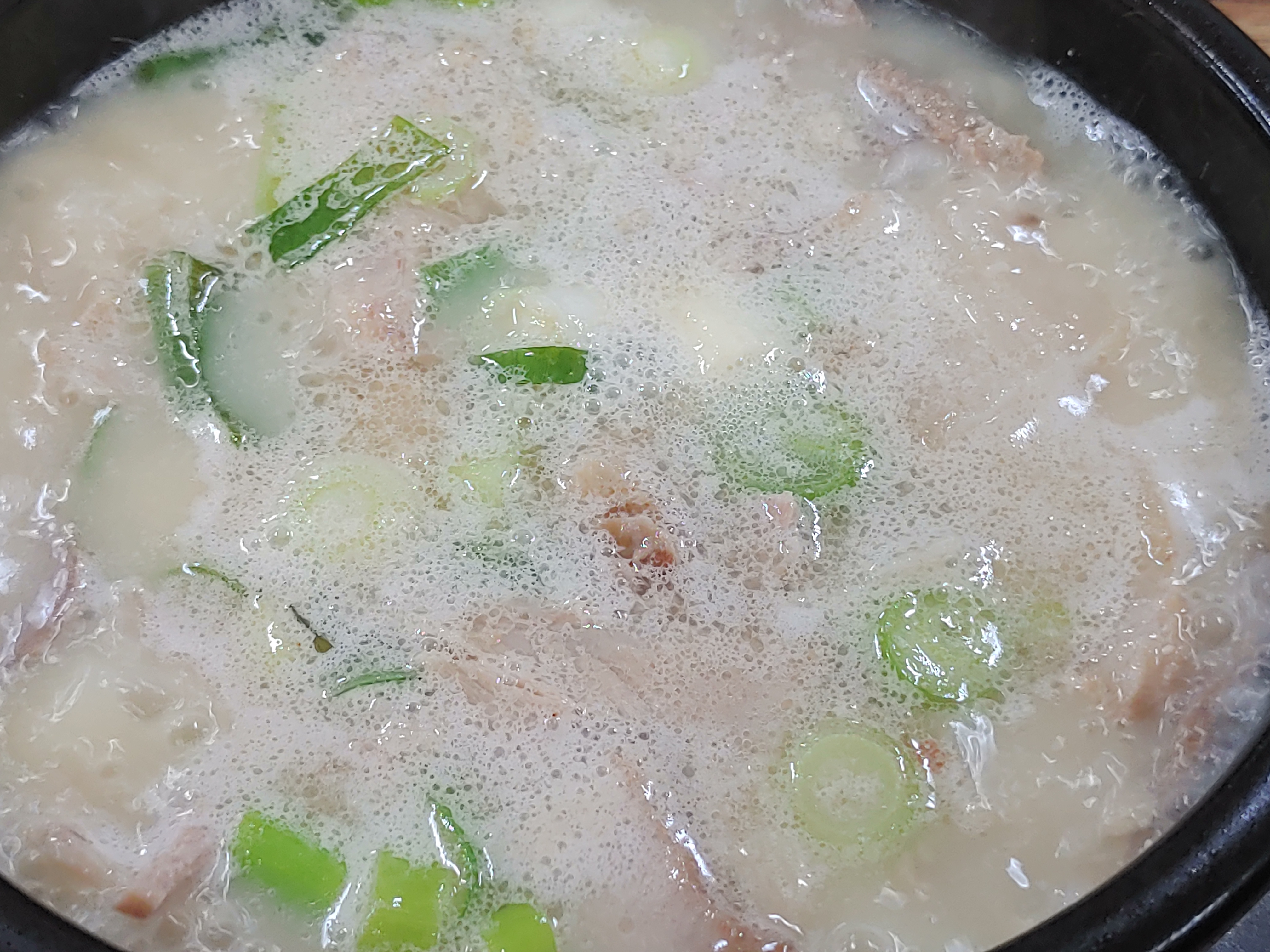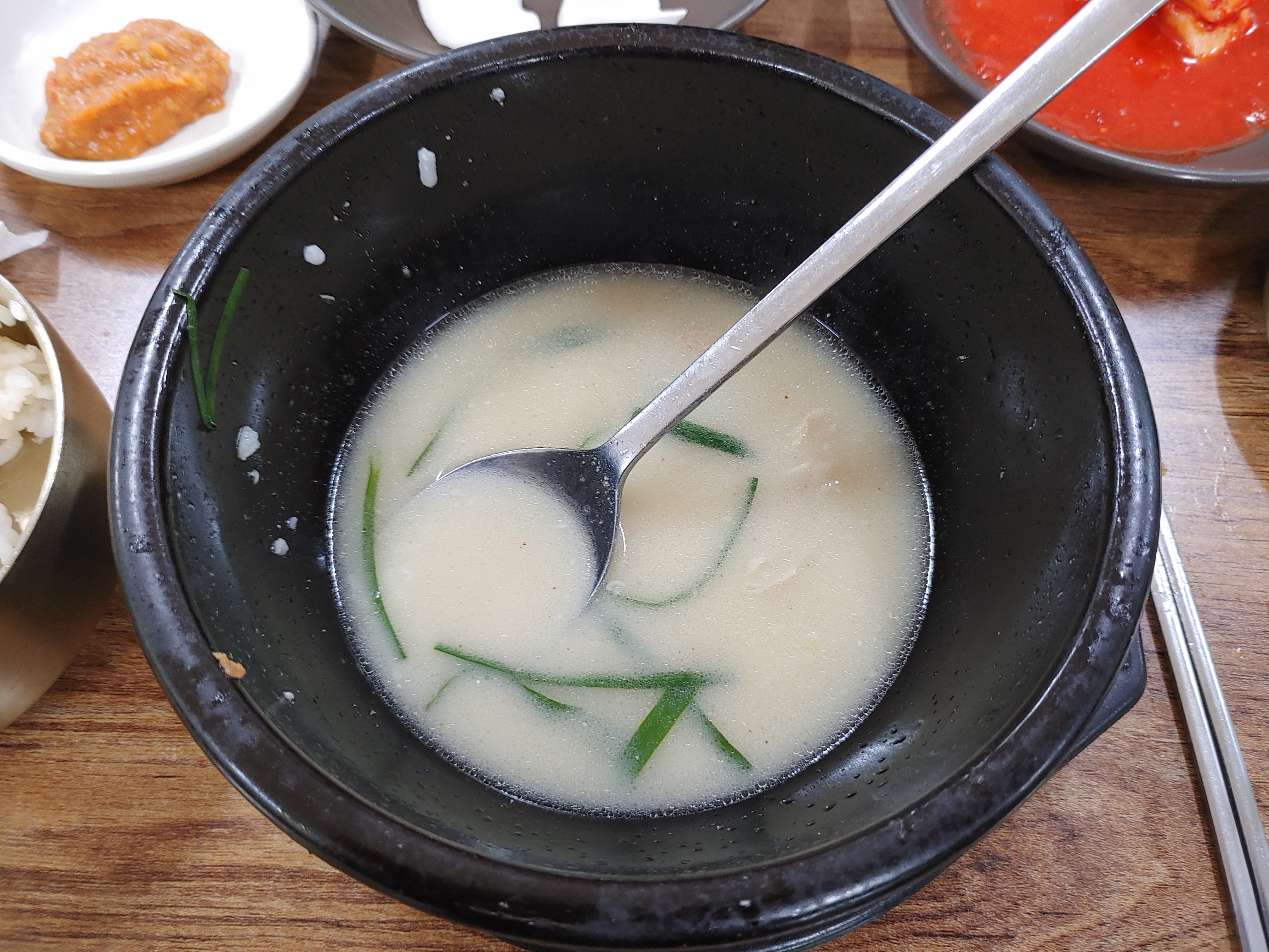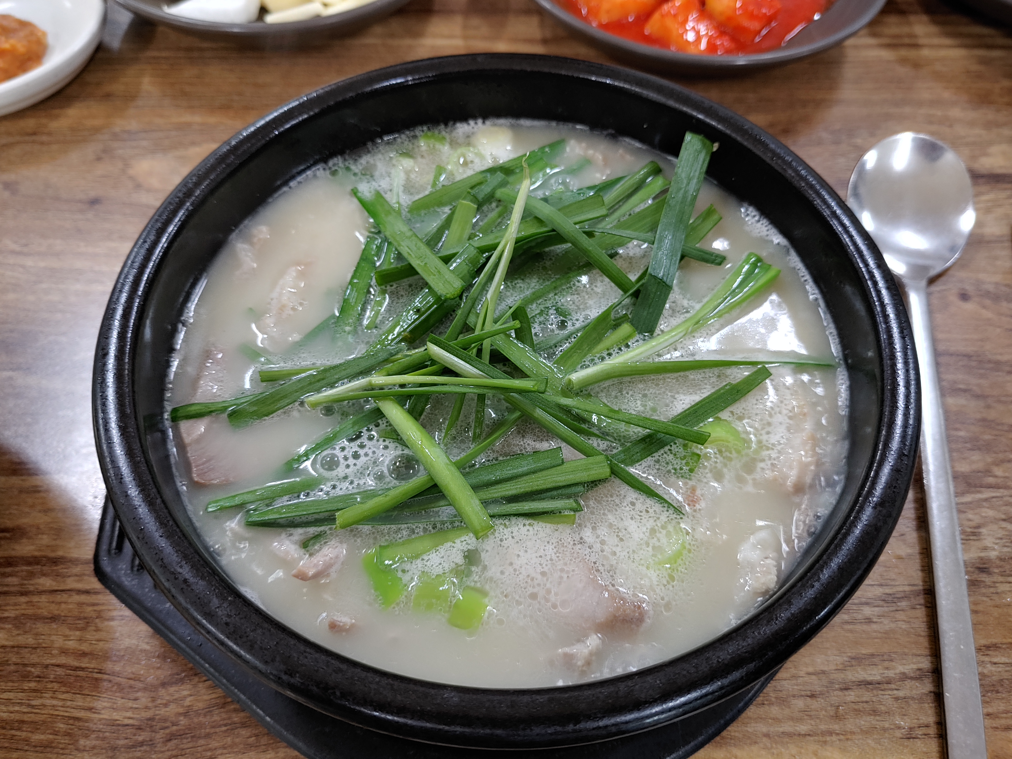 조금 있다가 주문한 돼지국밥이 나왔다. 국물이 뽀얀게 마치 설렁탕처럼 보이기도 했다. 돼지국밥에 부추는 필수다. 모자라면 더 주문해서 먹으면 된다. 나중에 알았지만 돼지국밥은 내장을 제외한 돼지고기만 나오는 국밥이다. 한 가지 잘 모르겠는데 섞어 국밥과 모둠 국밥의 차이는 아직도 모르겠다. 다음에 기회가 있으면 차례차례 주문해서 먹어봐야겠다.