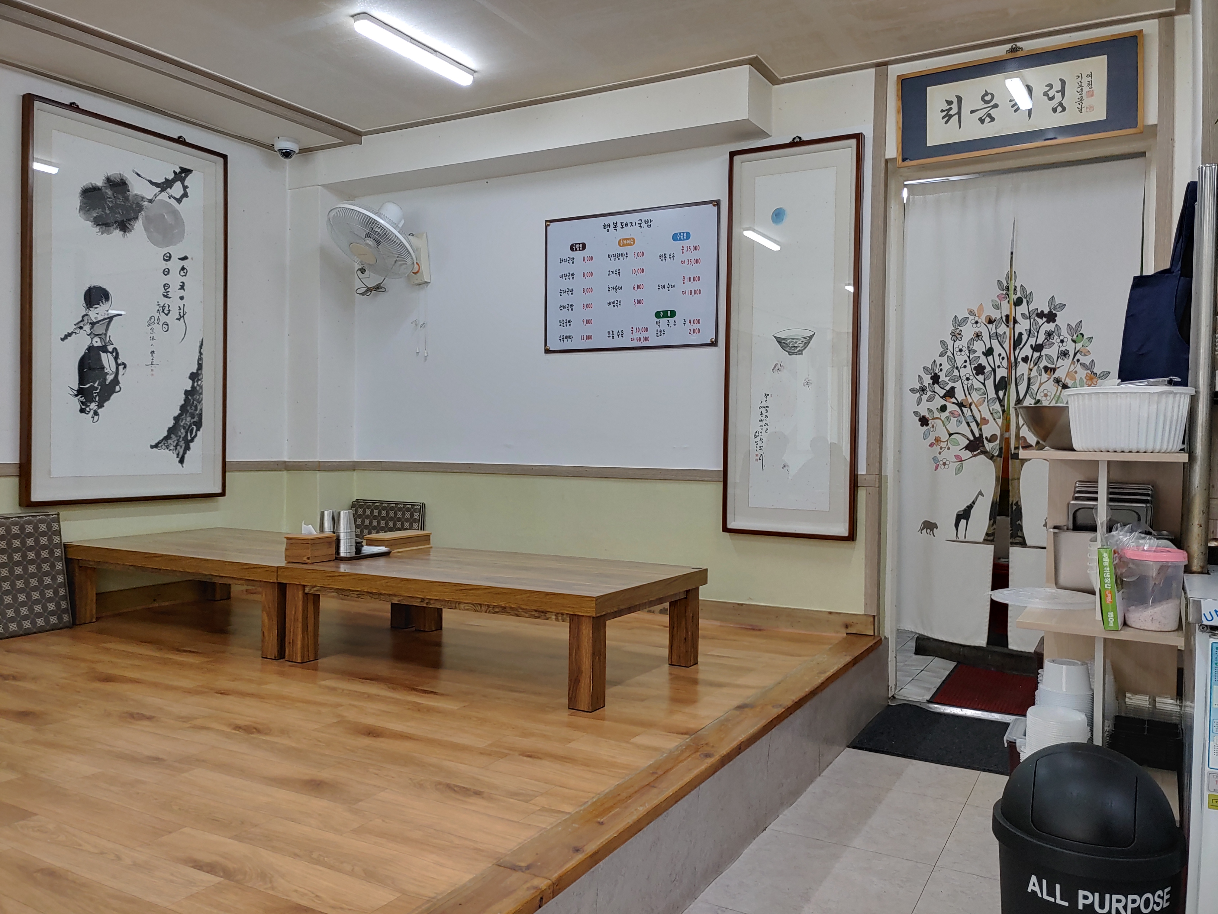 좌식으로 된 테이블과 식탁테이블이 있다. 여러 명이 와서는 좌식으로 된 테이블에 앉아서 먹으면 된다. 의자가 있는 테이블은 4명이 기본으로 앉을 수 있다. 여러 종류의 메뉴가 있는데 솔직히 잘 모르겠다. 메뉴 종류는 돼지 국밥, 내장국밥, 순대국밥, 섞어 국밥, 모둠국밥이 있다.